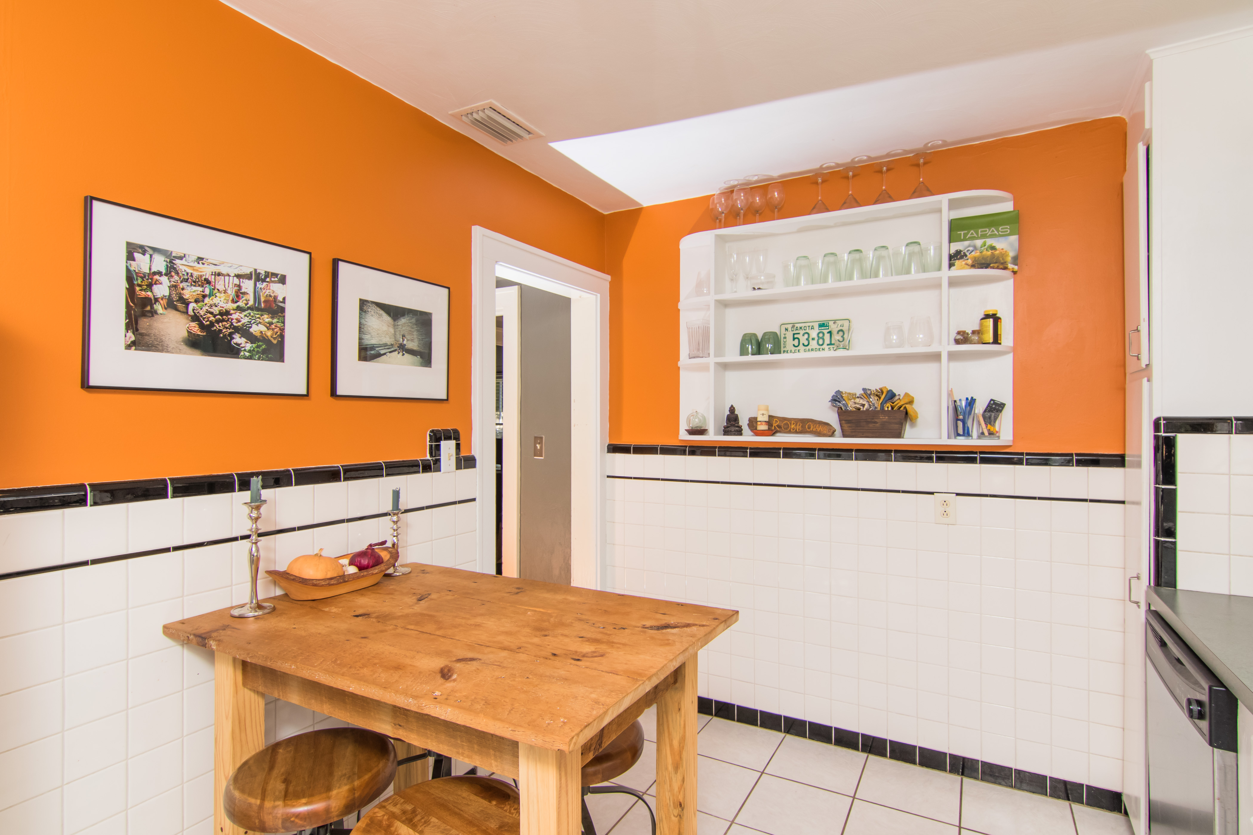 The larger bedroom is in front and will not lack for guests who’ll flock to town to visit. A painted wood floor complements the color palette and it’s roomy enough for rest, work and catching up on favorite movies. The second bedroom, shared bathroom and kitchen all open to a short central hallway where a floor-to-ceiling built-in cabinet is used for extra storage. Recently renovated, the bathroom is dressed in white subway tile and black trim with Carrera marble on the floor. Worried about just one bathroom? The outdoor shower will take care of any back-up so let’s keep going. A cheerful eat-in kitchen can handle whatever you dish up and meals will flow out to the deck most of the year. Lots of open and closed cabinets display your favorite crockery and keep it within easy reach. Head out the back door to the outdoor living and dining room deck where you’ll enjoy morning coffee and evening cocktails where you can start and end each day. The door off the deck opens to the garage where washer and dryer are located. An eclectic industrial enclosure is a 7 x 7 shower where you can wash up after a hot day, bathe the 4-legged residents and rinse off your boards – all at the same time if you’re in a rush.