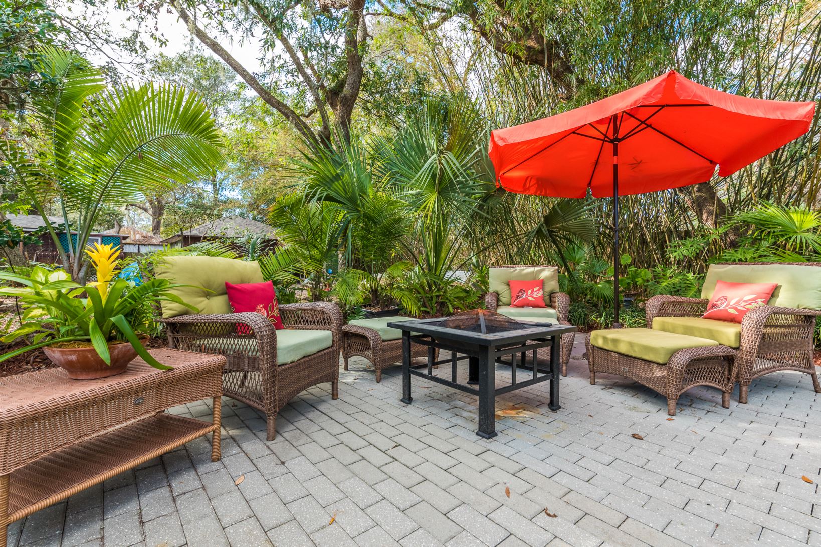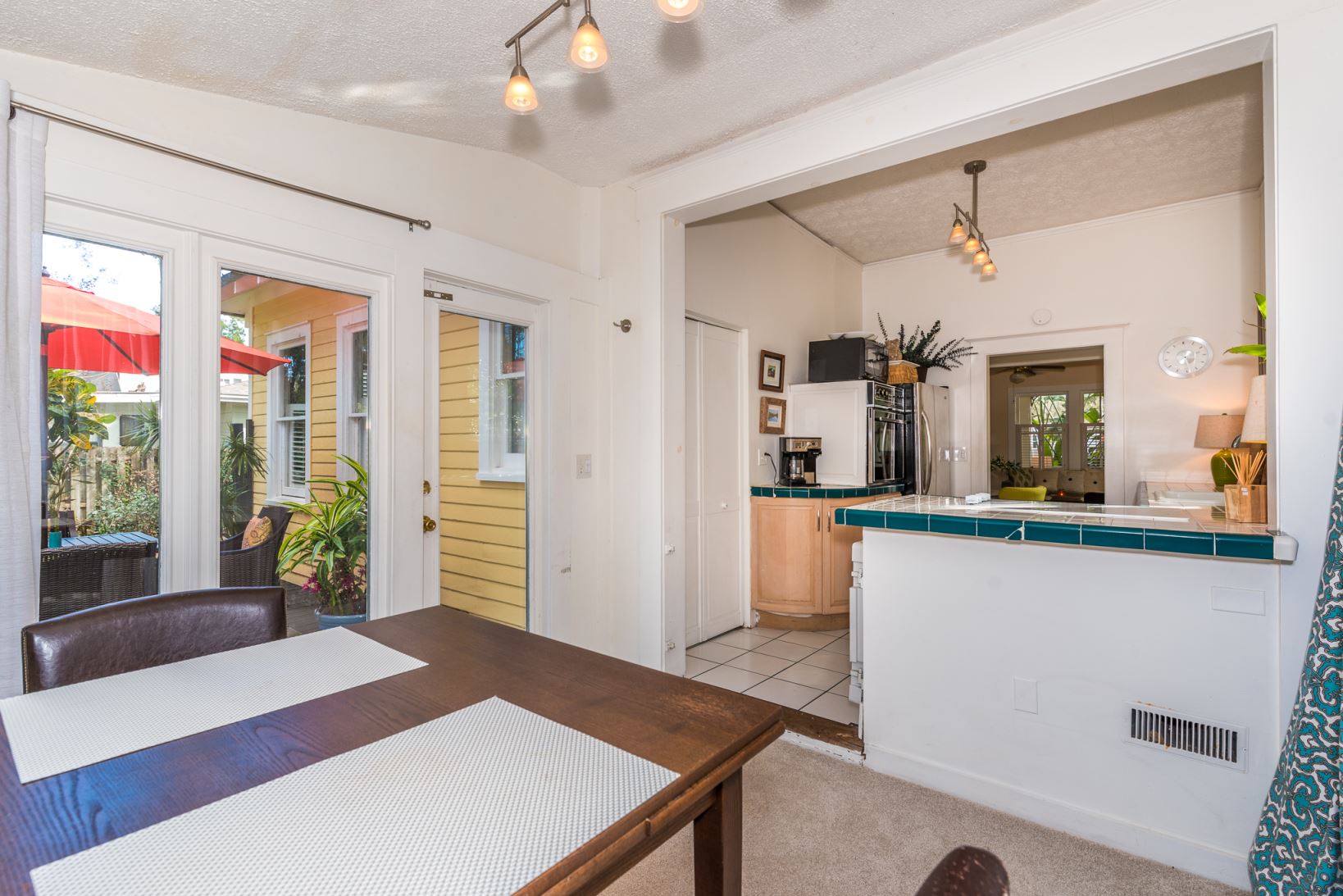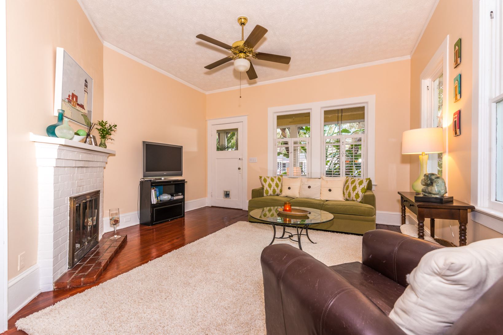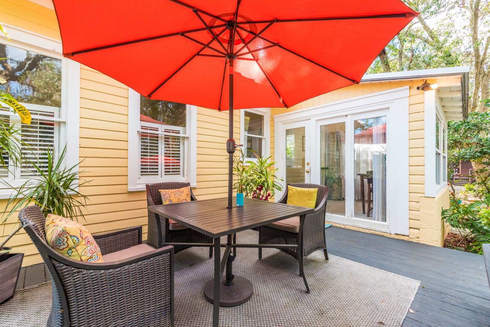 A stand of traveler’s palms frames this favorite uptown bungalow contrasting shiny green fronds with a soft yellow palette. An eye-catcher from the street, it delivers on its promise inside and out. A wide and deep front porch doubles as an outdoor living room with a southern exposure. Inside honey-hued wood floors reflect natural light courtesy of an abundance of windows throughout the house. A traditional floor plan works today with easy flow from front porch to common rooms to deck and patio.