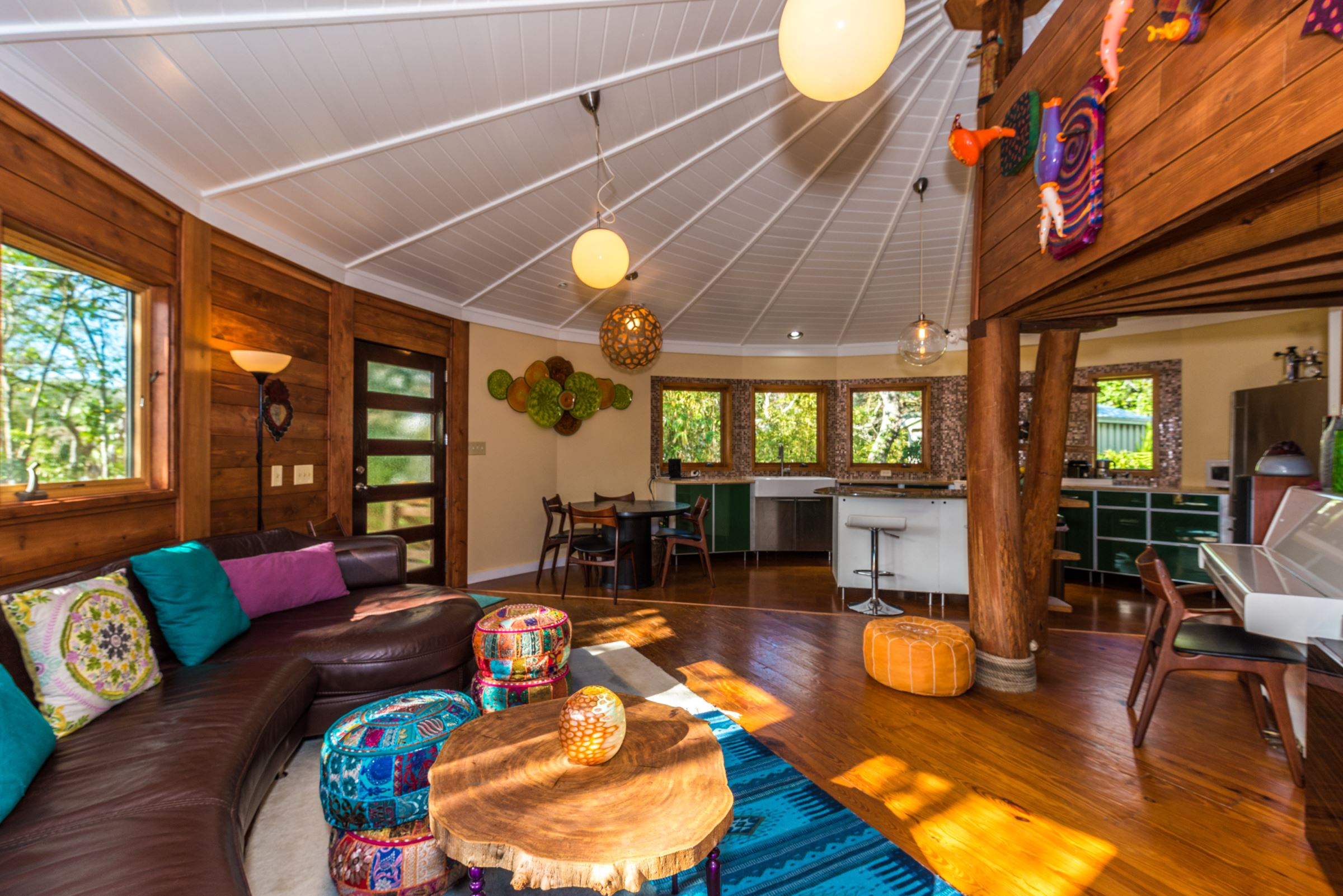 Set back sheltered from the street by a screen of foliage, pavered paths wind around to house, patio and a series of decks. Wraparound porch spans the front of house where the multi-paned front door beckons you enter. Inside living, dining and kitchen come together with a circular flow for ease of movement. The umbrella-like ceiling adds great volume and architectural interest to the space. Kitchen cork floors are soft on the feet and an island clad in Jerusalem Stone adds prep space and a place for culinary consultation. Check out the glass tile mosaic surrounding the wall of windows – crafted by the owner, of course, and don’t miss the hideaway loft.