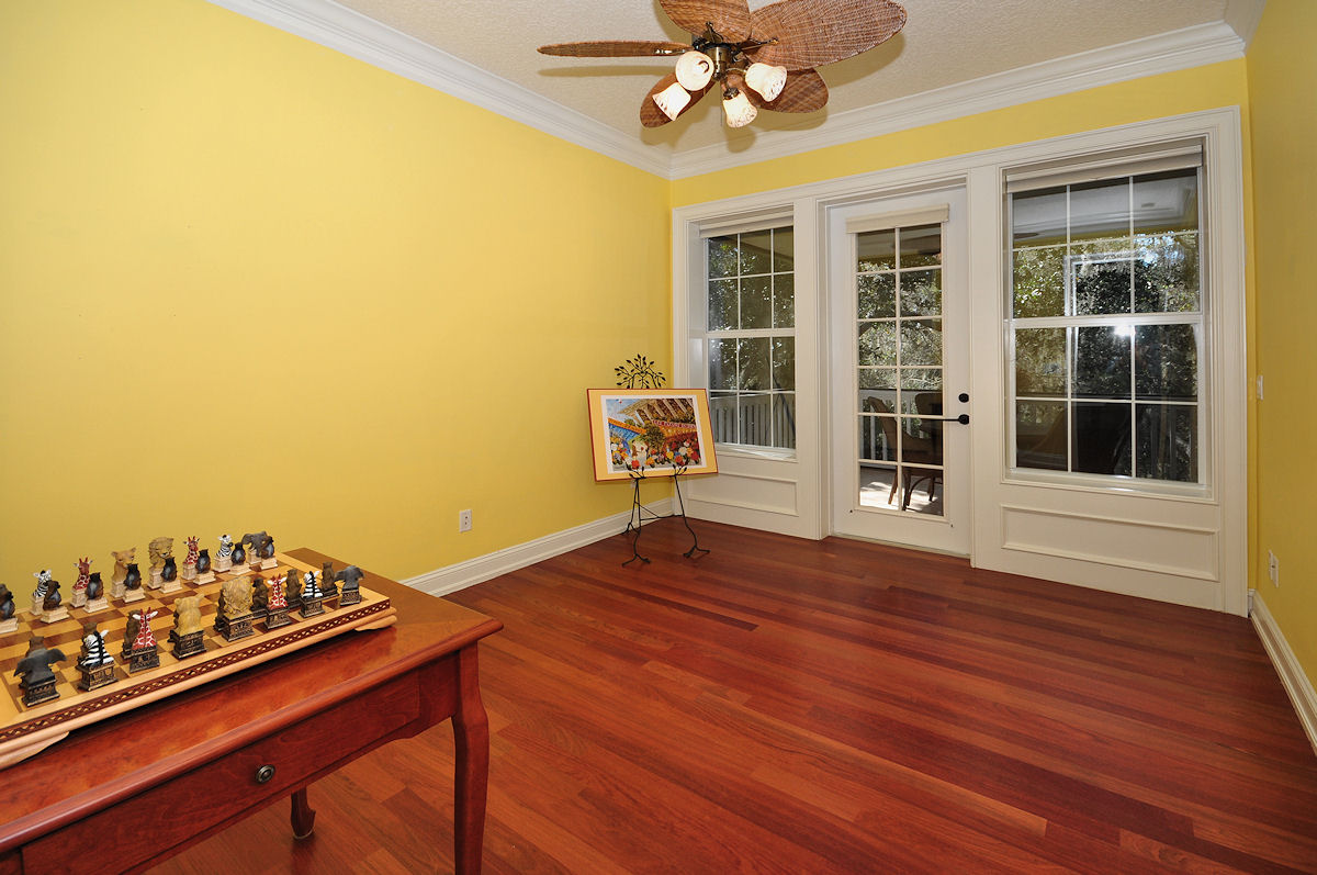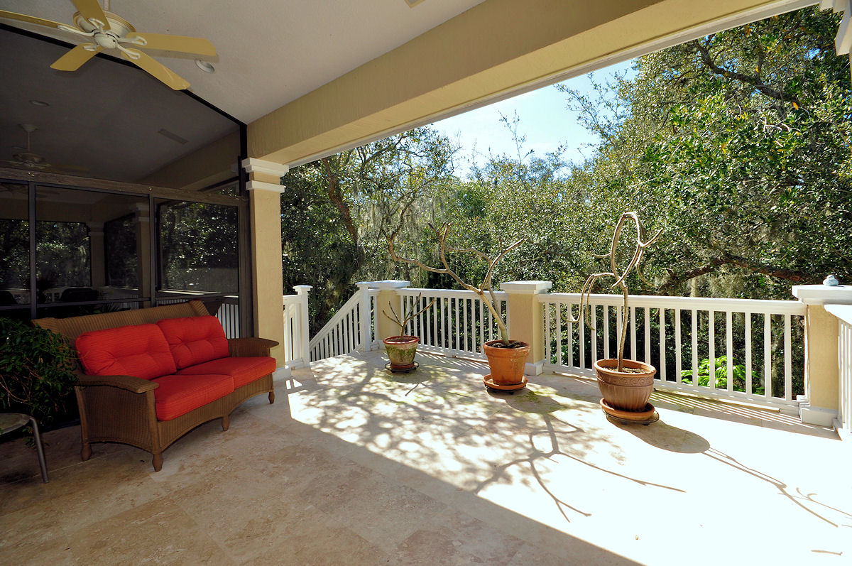 Covered verandas flank the front entrance and you can sip early morning coffee and listen to the morning birds’ serenade. A half flight of stairs leads you to a wonderful gathering room with a wall of windows overlooking the wooded preserve. 24′ of built-in cabinets and shelves offer a place for everything and leaves the rest of this generous room with its 11′ ceiling open for several seating areas. French doors lead to the covered veranda which spans the width of the house. An outstanding kitchen has more cabinets and counterspace than you can fill and the crisp black granite nicely complements the rich cherry wood. A long bar separates the space from the dining room which opens to a screened porch for outdoor meals under the lazy paddle fans. A dedicated office with pocket French doors enjoys a wall of built-in shelves flanking a gas fireplace.