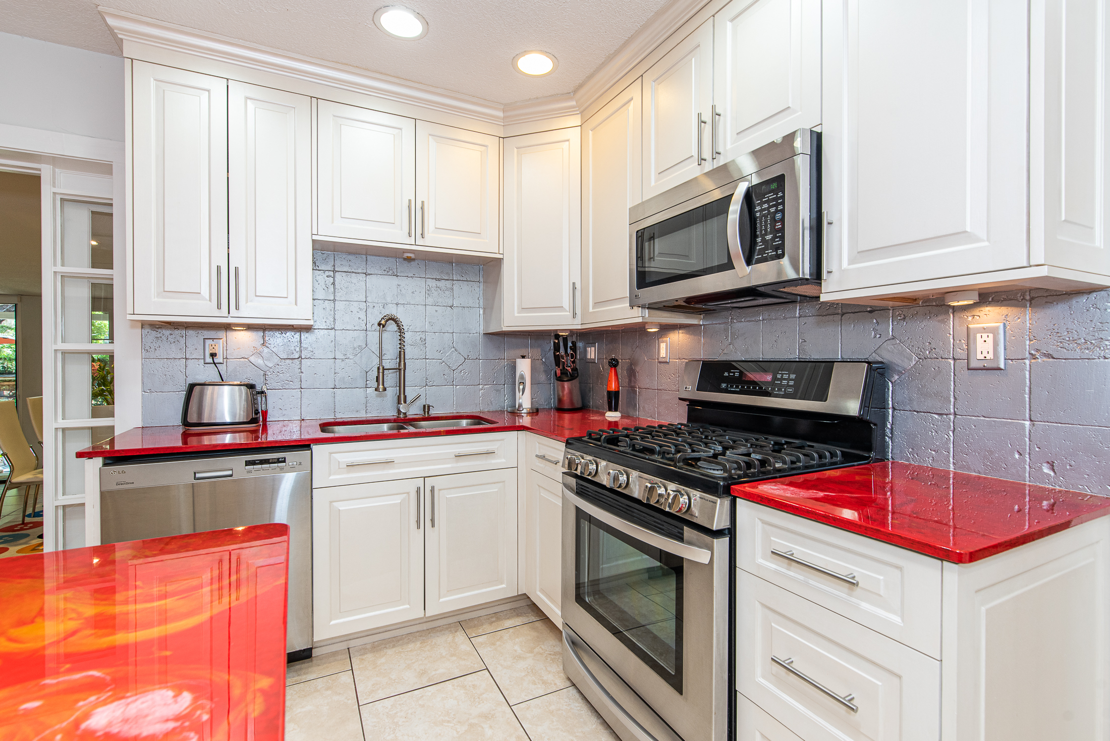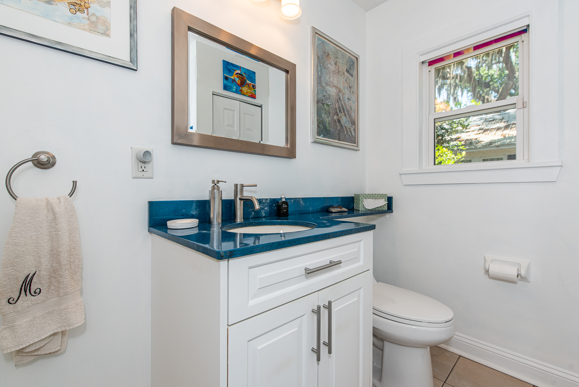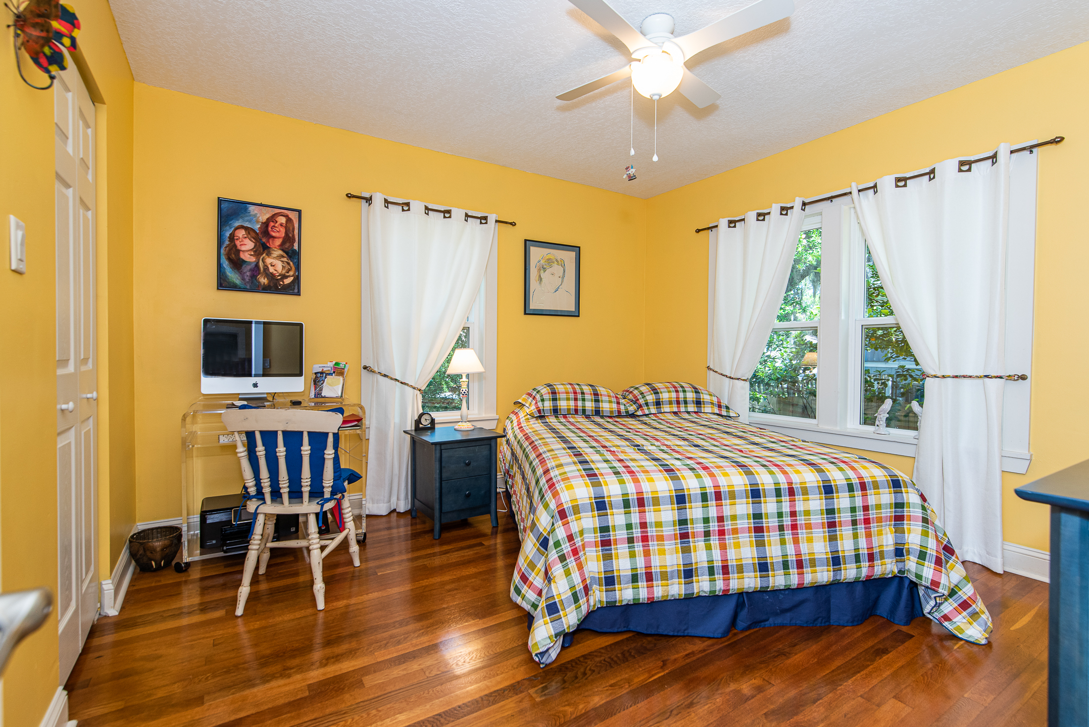Entry foyer is tiled with wainscot on the walls. Original living room is simply lovely – natural light makes the wood floors gleam and the fireplace will be delightful when the seasons change. Owners cleverly turned an under-the-stair closet into a wee library – a great place for books or to display other treasures. Irrepressibly cheerful kitchen is in the center of the house opening to living and Florida rooms for easy flow. 2 or more can easily work together and the center island is ideal for prep and presentation. Laundry room is off the kitchen – a wall cabinet keeps things organized and you can access both the garage and attic (real steps!) from here.