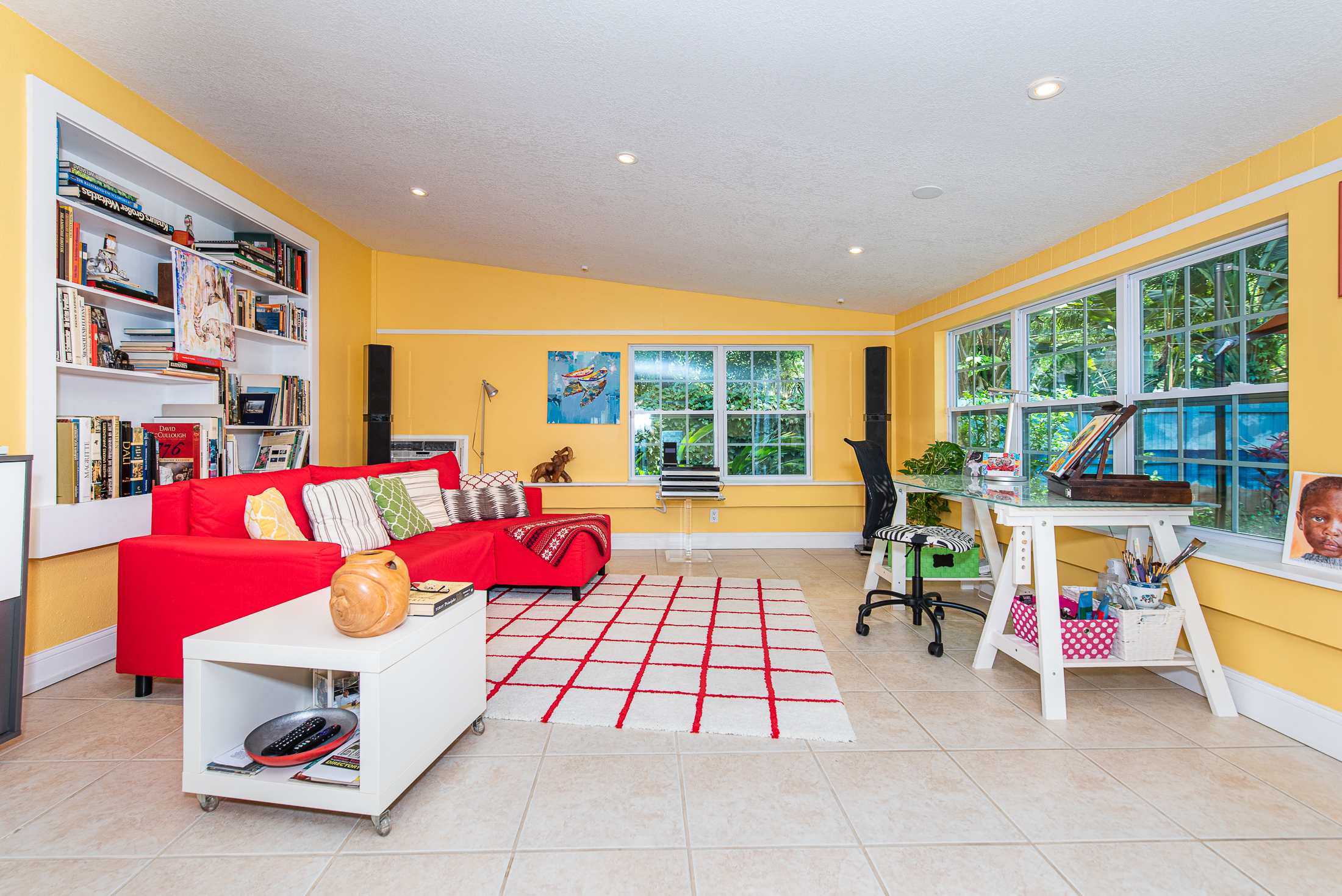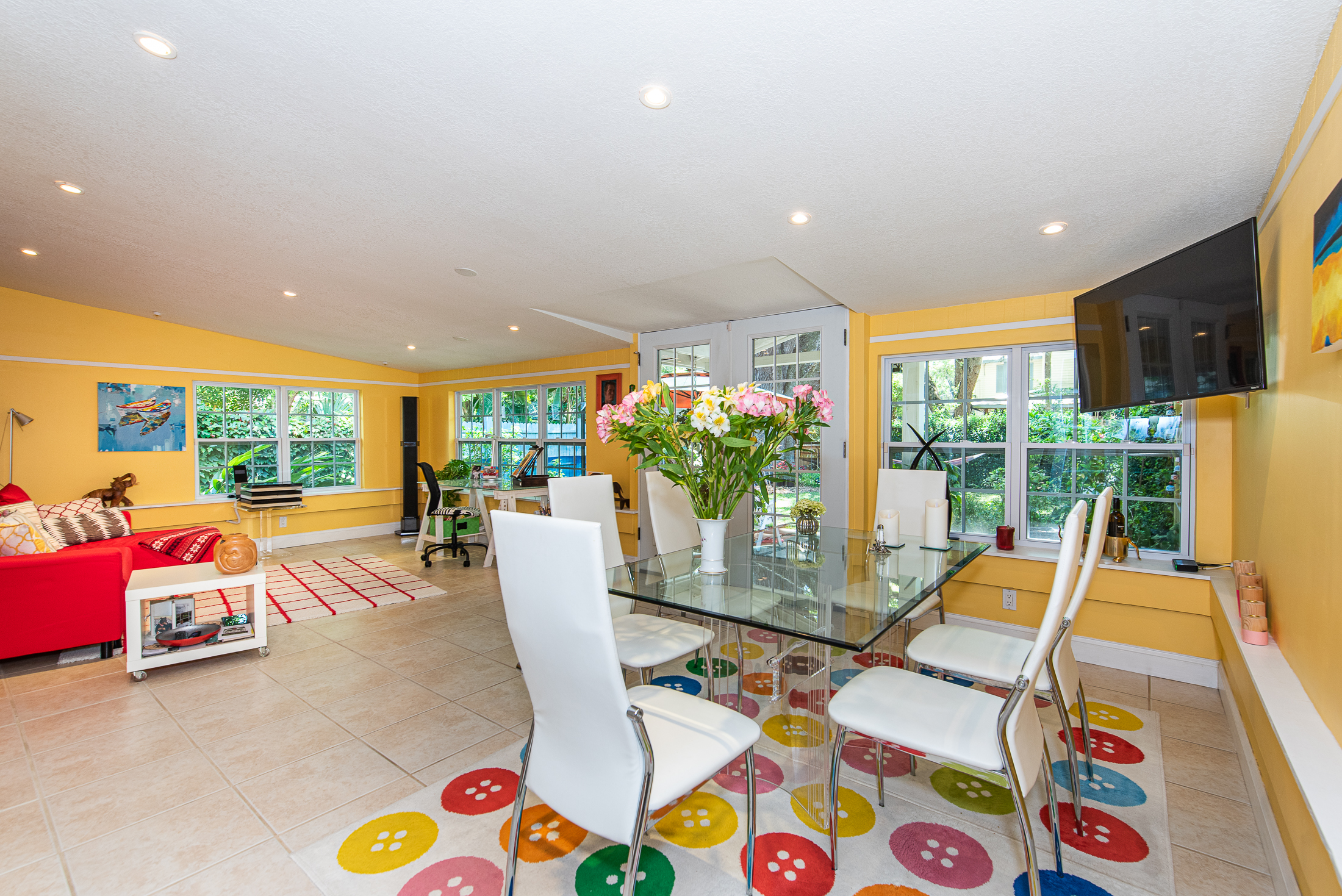 En-suite, the primary bedroom is on the west side. A peaceful retreat with private bath and courtyard. Additional bedrooms are off the living room. Nicely proportioned with large closets, these 2 share the updated hall bath. French doors separate the kitchen from Florida room which is where the owners spend most of their time unless they’re in the garden or puttering in the big garage. 2 walls of windows overlook the backyard. A very generous room, it currently serves as the media room, dining area and office. No matter how you use it, this is bound to become a favorite place to nest.