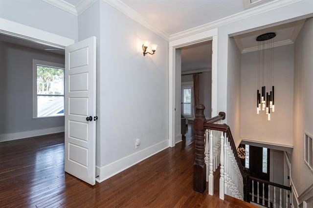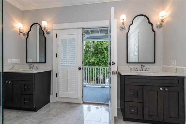 Upstairs, two guest bedrooms share a full bath, while a spacious junior suite includes its own private bathroom with a walk-in shower. At the east end, the primary suite offers a tranquil sanctuary with two balconies, a private sitting area, peeks of the Matanzas River, and a generous bathroom featuring a modern clawfoot tub, walk-in shower, double vanity, and walk-in closet.