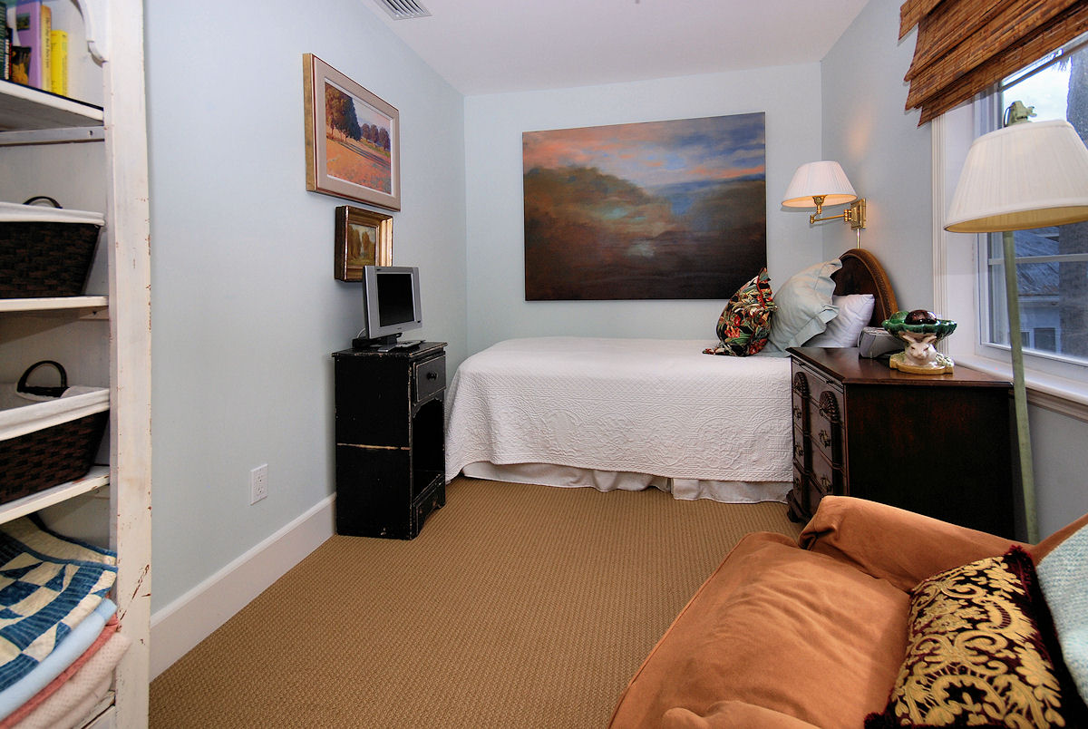 The master is simply lovely – sunny, breezy and the wonderful new wraparound porch will be a favorite spot year-round. Enjoy calming views of sailboats passing by on the river and watch the water birds take wing. Sitting out here will make your worries disappear – try it! The master bath offers a generous tub and separate walk-in shower – all dressed in white. A walk-in closet and double linen storage are rarely found in houses of this vintage, but here they are and most welcome. An en-suite guest room at the back overlooks the walled garden and features a lovely new bathroom with large shower. The utility room is upstairs and also serves as an overflow closet for the guest room.