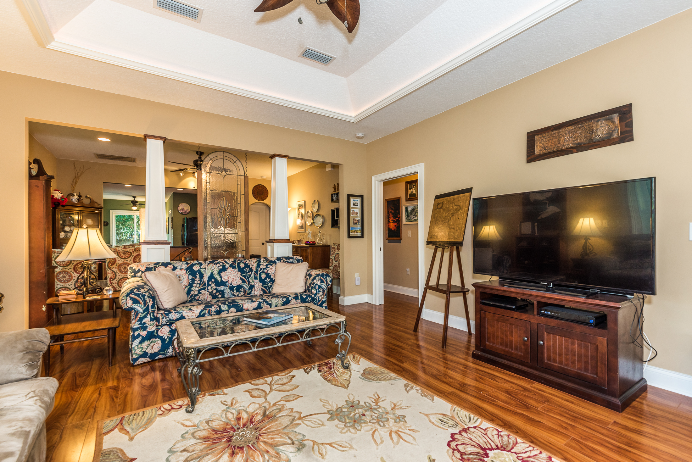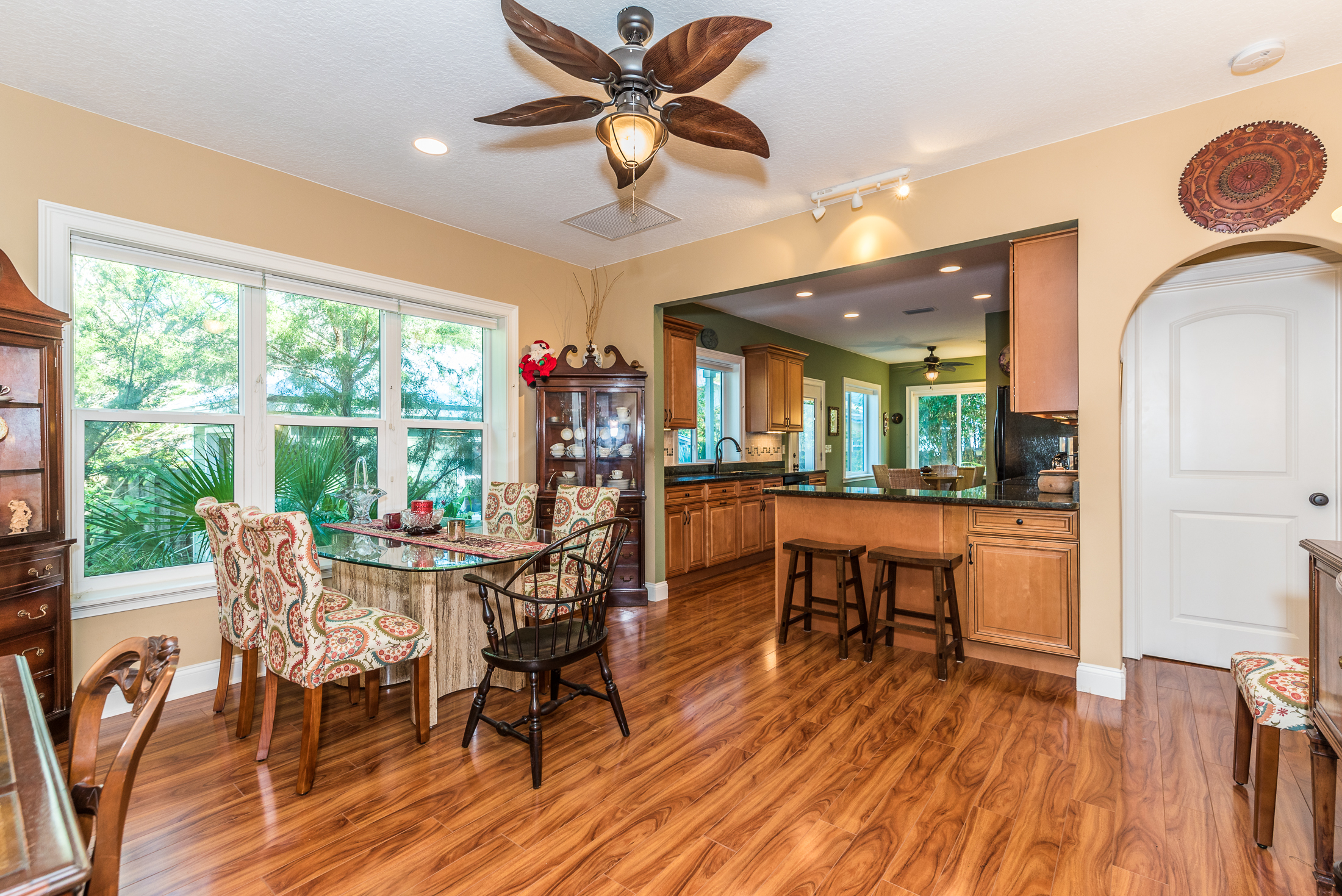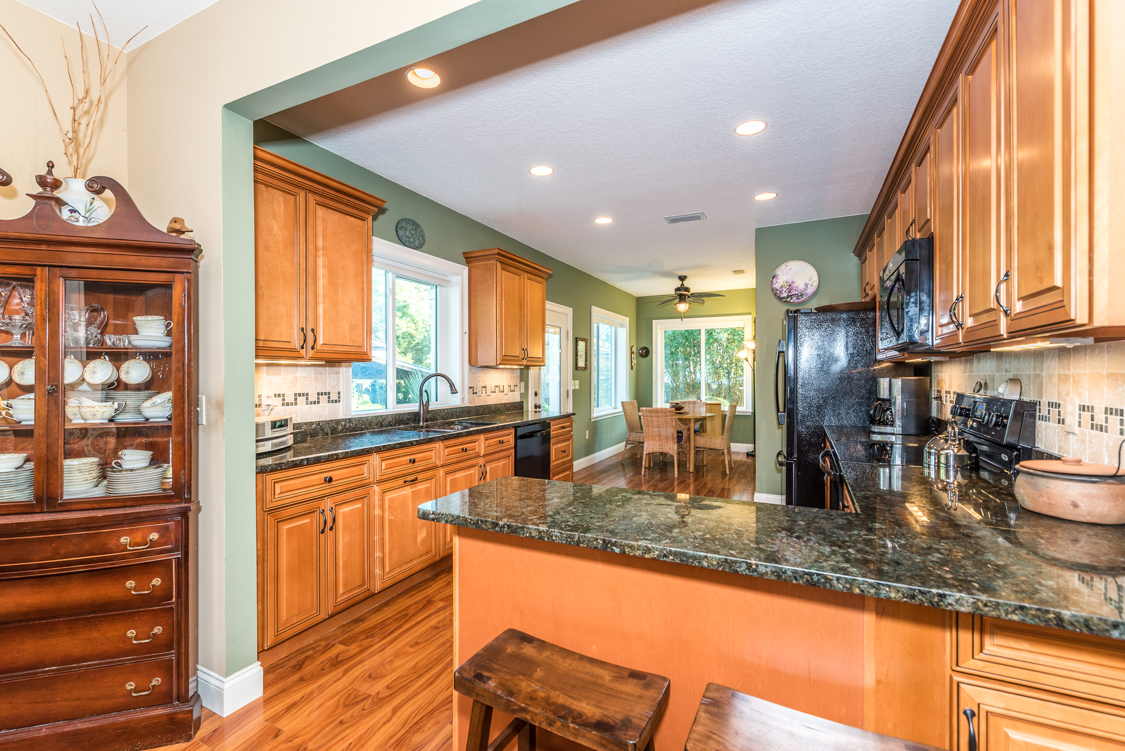 Inside, the living room’s illuminated tray ceiling softly lights the space and a corner fireplace hopes for cool nights. Classic columned entry separates living from dining where you dine under a bank of 3 big windows. Expansive kitchen will easily handle a handful of helpers thanks to its intelligent design. An abundance of cabinets and counter-space keeps everything within easy reach so you can cook with abandon! A breakfast nook at the east end of the kitchen provides a sunny spot for morning coffee. Walk-in pantry is also home to the washer and dryer and you can sneak through the master closet from here too. En-suite owner’s quarters also enjoy a lighted tray ceiling. In addition to the walk-in there’s a wall of closets in the bedroom as well. Long granite vanity (look for the gold mica flakes in the stone) has 2 sinks and plenty of storage. Generous shower is fully tiled and the high transom window lets in southern light. 2nd bedroom has custom built-in micro office that closes up like a closet. 3rd bedroom looks into front garden and pond and both rooms share nicely executed hall bath. Take the door from kitchen to backyard where a covered patio overlooks a large pond. Grilling and outdoor dining are a regular event out here. Garage is presently used as workshop so the sliding screen door is a perk when weather is cool and a plumbed sink is handy for cleanup. Solar panels cut down on your costs and you can even charge your car. Read the owner’s story about living here!