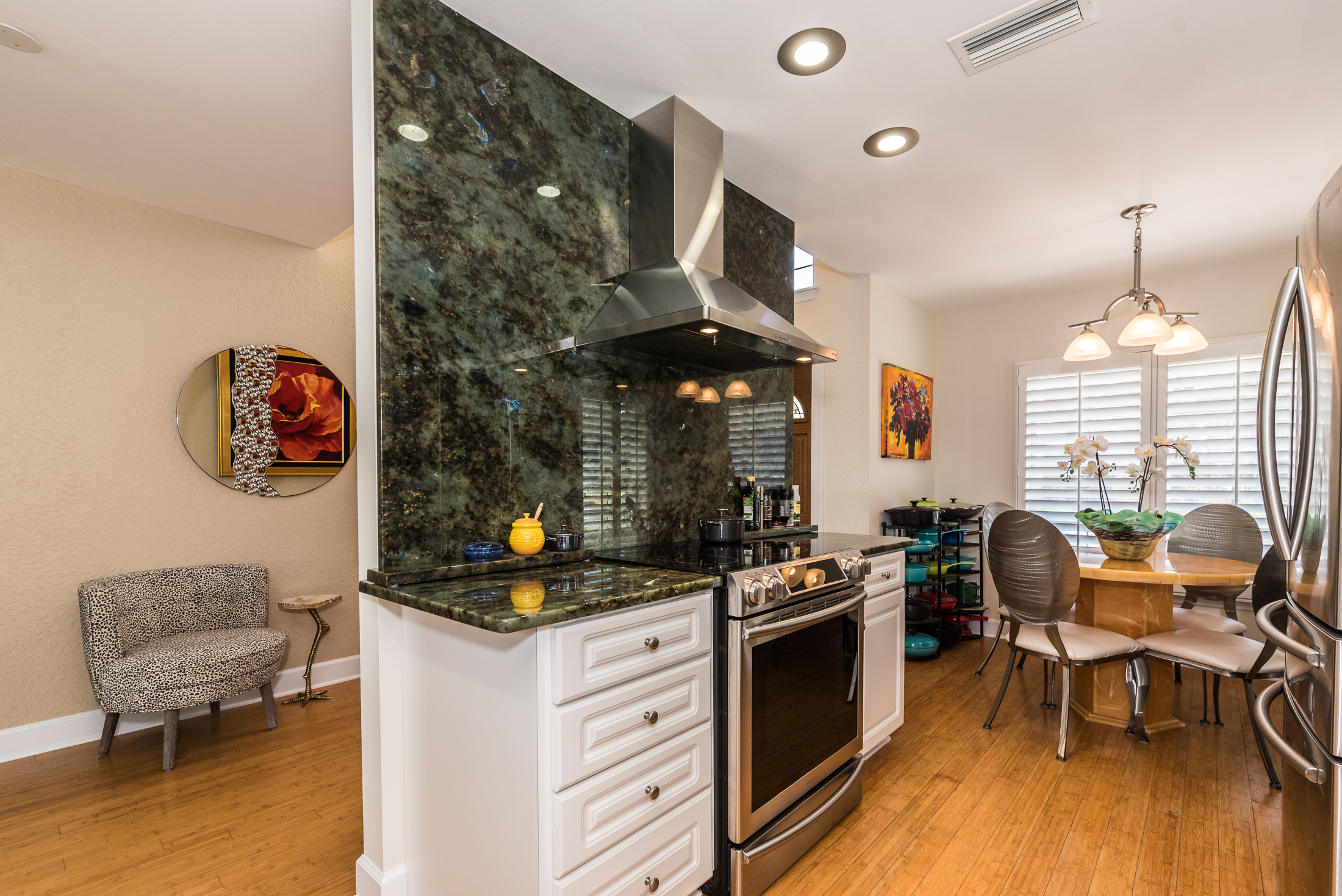 Honey-hued wood floors complement crisp white walls which offer an abundance of room to display all your favorite art. Right off the foyer, a well planned kitchen with breakfast nook invites you to flex your culinary muscle in style. Counters of labradorite have gems and fossils hidden in the deep green stone – beautiful to see and a wonderful surface for meal prep. Pass-through window keeps you connected to guests who are sitting at the curved bar on the dining alcove side.