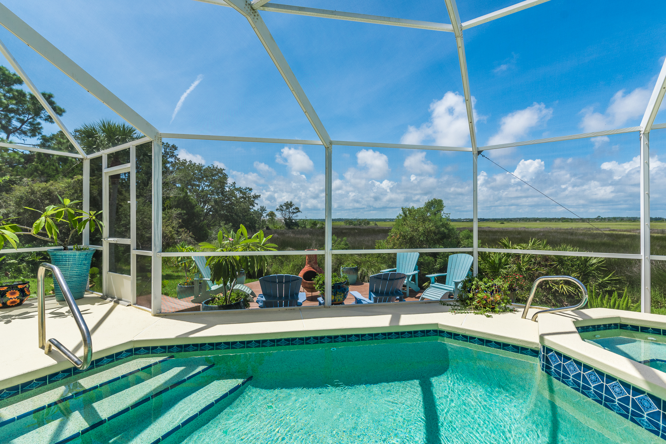 Tall windows along the east and southwest walls invite natural light inside while sliders take you out to screened pool and spa. With our temperate climate, you can enjoy a swim most of the year and have a front row seat to witness the colors of the marsh as they change with the seasons.