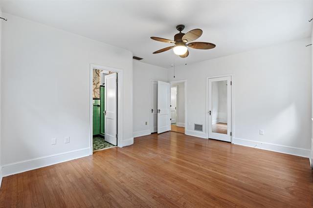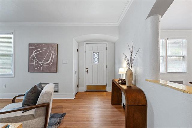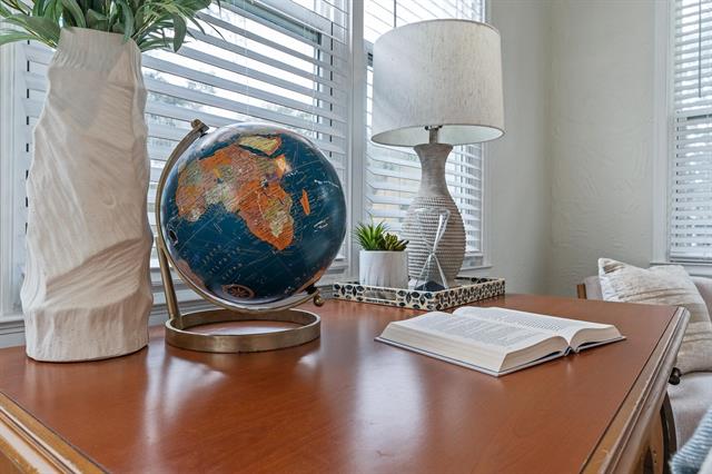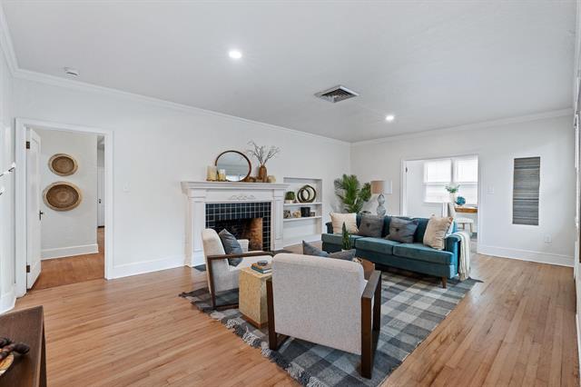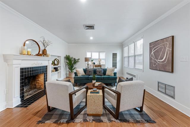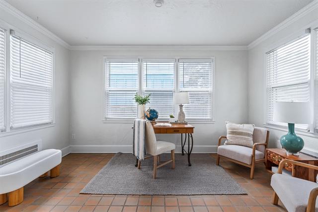 Designed in an era that celebrated generous proportions and natural light, this 1941 mid-century modern home offers spacious rooms and multiple windows throughout. Rich honey-toned oak hardwood floors run seamlessly from room to room, beautifully complementing the soft cream interior palette. The expansive living room serves as a focal point, complete with classic fireplace, abundant natural light, and ample wall space for showcasing art collections. French doors open to a versatile 15′ x 10′ flex space – think home office, home gym, media room, art studio, playroom, or additional family room. Surrounded by windows on three sides, it radiates year-round cheer.