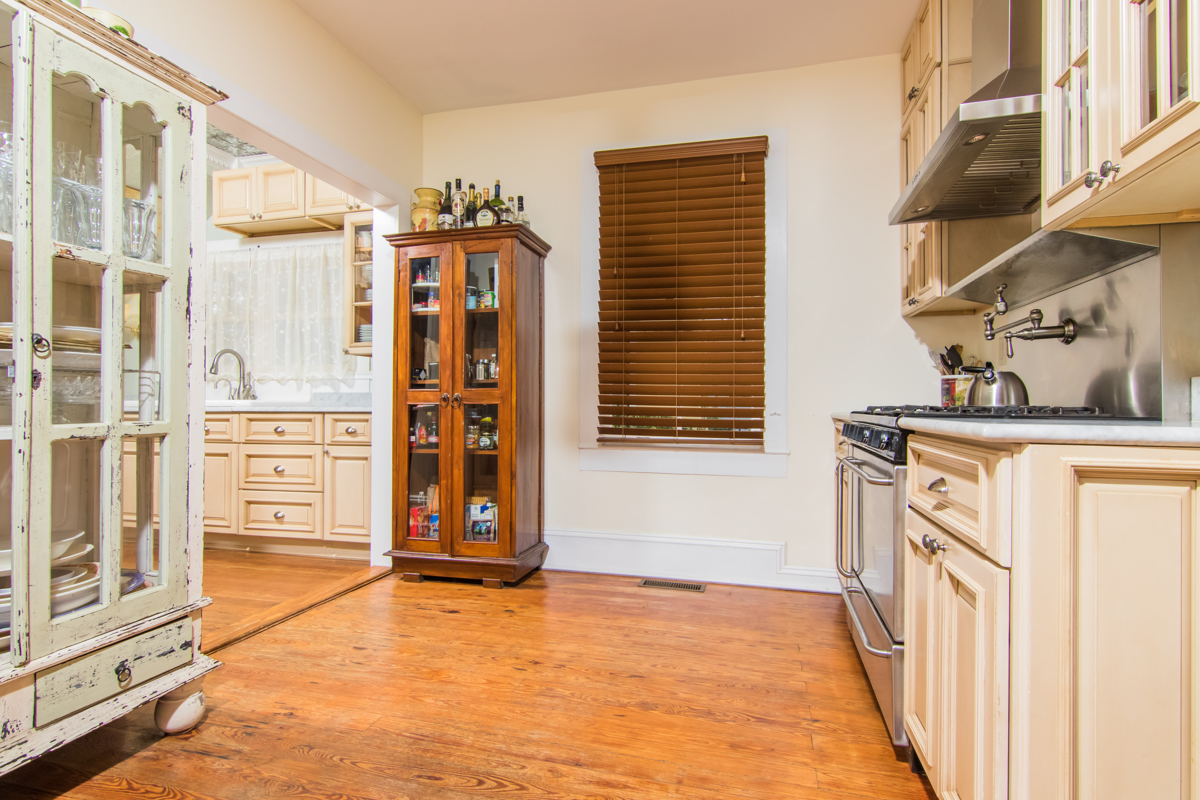 Opening to the dining room courtesy of a large pass-through, the kitchen comes in two parts. The galley portion has marble countertops, tin ceiling, restored gas light fixtures and egg and dart molding. The gourmet gas range w/pot filler and refrigerator are in the adjoining room along with a pre-Civil War corner cabinet used as a pantry.