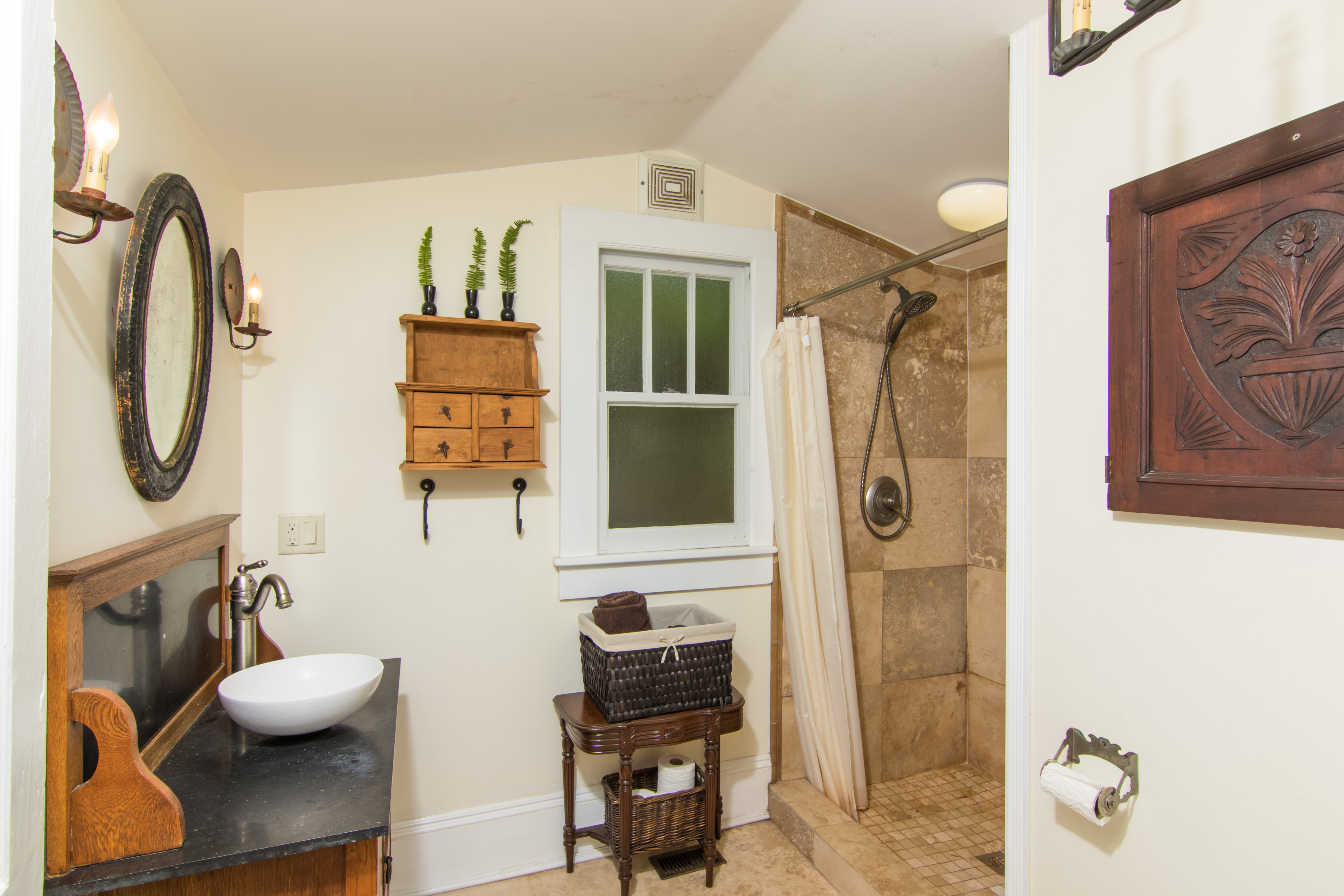 Upstairs the master’s quarters are at the front. A generous room with a sitting alcove (or micro-office) and a private porch, this is a sweet retreat at day’s end. A two-tier tray ceiling sets off the vintage chandelier and making for a lofty feel. The bathroom is accessed from both master and hall for use by the second bedroom. With a jetted clawfoot Jacuzzi and an 1800s vanity with vessel sink and French oak mirror it has an elegant ambiance. 2nd bedroom has a richly hued wood ceiling and a private treetop porch.